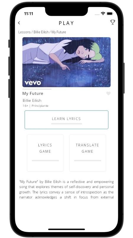 ¿Y si tu gran historia de amor fueras tú mismo? Billie Eilish, la sorprendente artista de Estados Unidos, nos invita en "My Future" a hacer una pausa para mirarnos al espejo y enamorarnos de la persona que seremos. La canción mezcla un inicio suave, casi introspectivo, con un ritmo más optimista que refleja el momento en el que la cantante decide cambiar de rumbo y priorizarse.