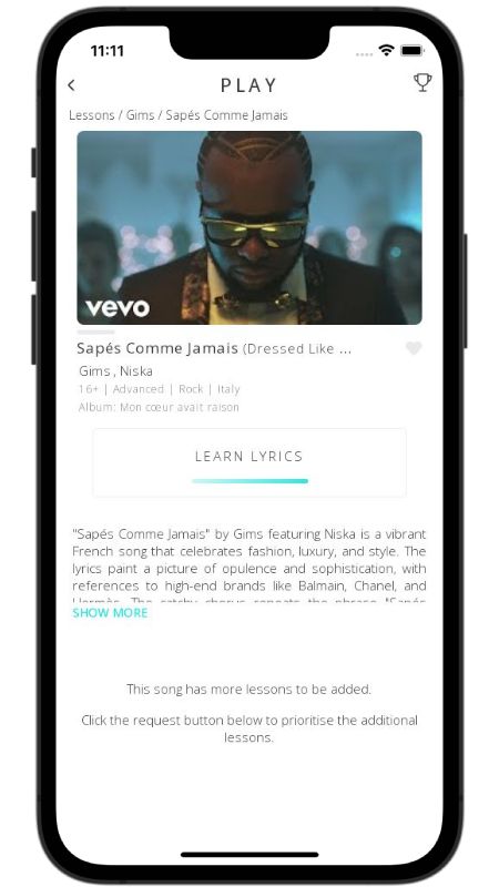 "Sapés Comme Jamais" by Gims featuring Niska is a vibrant French song that celebrates fashion, luxury, and style. The lyrics paint a picture of opulence and sophistication, with references to high-end brands like Balmain, Chanel, and Hermès. The catchy chorus repeats the phrase "Sapés comme jamais" (dressed like never before), emphasizing the idea of being impeccably dressed and exuding confidence. The song's upbeat tempo and energetic rhythm make it a perfect choice for language learners looking to immerse themselves in French culture and music.